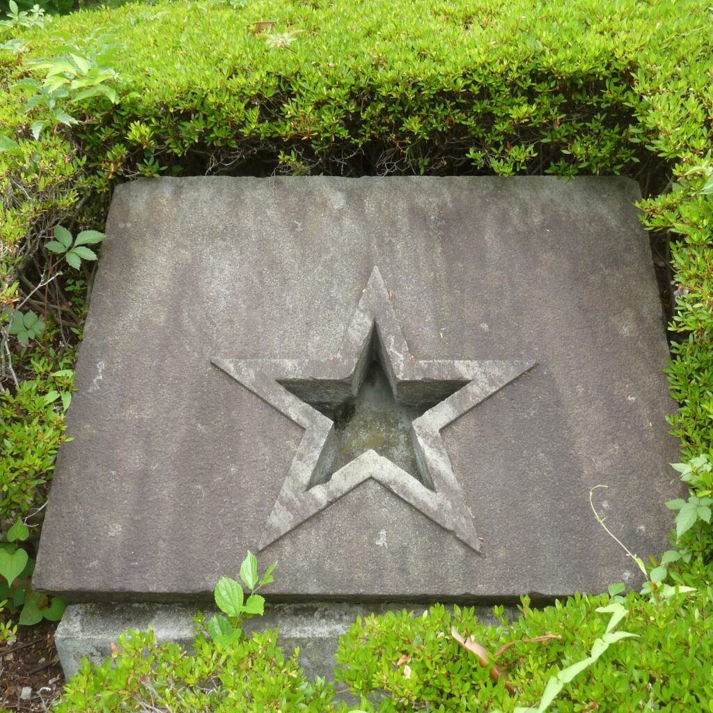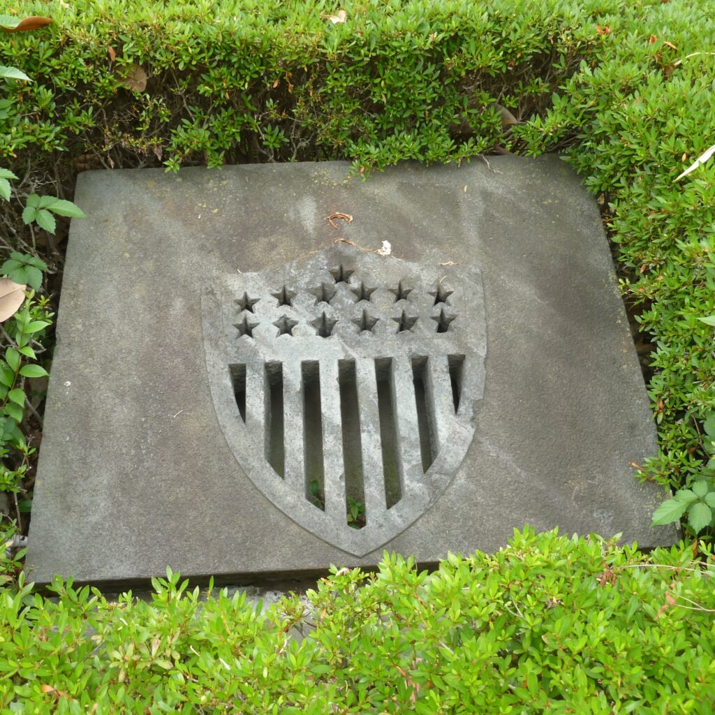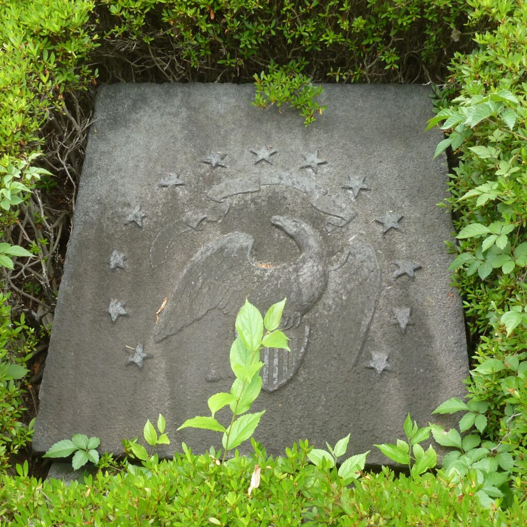麻布善福寺に1859年に開設されたアメリカ公使館は,火災のため1863年に横浜関内の外国人居留地に移転していたが,1874年に横浜の居留地から築地の外国人居留地に再移転した.1890年に赤坂にある現在のアメリカ大使館 (1906年に公使館は大使館に昇格した) に移転するまで,アメリカ公使館は現在の聖路加ガーデンの銀座クレストンホテルの辺りにあったのだが,移転後そこには小松石のアメリカ公使館石標が残された.現在,それらはアメリカ公使館跡の記念碑として,聖路加国際大学の構内に五稜の星,白頭鷲,盾形の星条旗の3個の石標が,聖路加ガーデンには2基 (星と星条旗),そして残りの3基 (星と白頭鷲と星条旗) は赤坂のアメリカ大使館に置かれている.