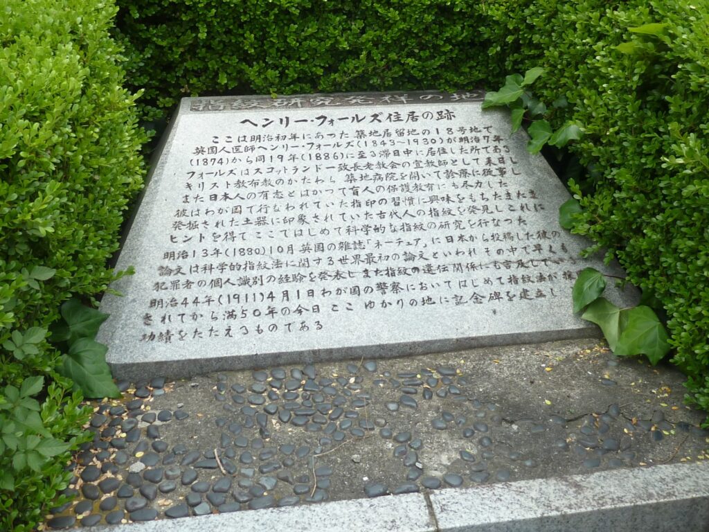 聖路加国際大学には女子学院発祥の地の碑や立教学院発祥の地の碑が設置され,聖路加タワー近くの交差点にはヘンリー・フォールズ住居の跡の石碑が置かれている.女子学院の始まりは,1870年にジュリア・カロゾルス (夫は米国長老教会の牧師でジュリアは信者) が築地居留地6番に創設したA六番女学校である.1874年にチャニング・ムーア・ウィリアムズ主教 (アメリカ聖公会の宣教師) が築地外国人居留地に創設した立教学校 (聖書と英学を教える私塾) は現在の立教学院になり,1901年にルドルフ・B・トイスラー博士 (アメリカ聖公会の宣教医師) が創設した聖路加病院は現在の聖路加国際大学になった.そしてヘンリー・フォールズ住居跡は指紋研究発祥の地でもある.1880年に科学的指紋法の研究を発表し,日本の警察で指紋が犯罪者の個人識別に初めて採用されたのが1911年であるとその碑には記されている[注3].