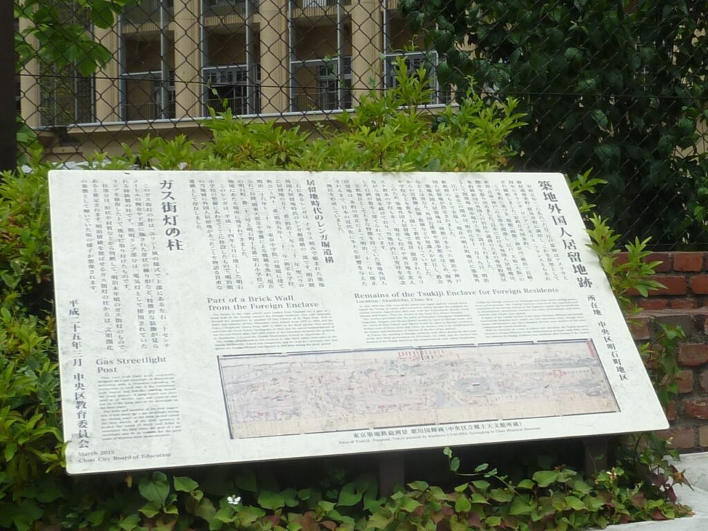 築地外国人居留地跡の説明板には,1858年の安政5か国条約で築地に外国人居留地が設けられたのは1869年で,1899年に廃止されたと記されている.この条約では江戸の開市は1862年と定められたのだが,その後,1869年に延期されたのは激しい攘夷運動による国内の混乱の影響が大きかった.条約を締結し,開市の延期交渉を行ったのは江戸幕府だが,外国人居留地が設けられたときには幕府は既に滅び,攘夷運動の首謀者が政権を担っていた.外国人居留地にはアメリカ公使館が移転し,キリスト教の学校も創設された.そして1868年には現在の新富町に外国人客を見込んだ新島原遊郭が早くも建設されたのだが,不人気のため1871年には早くも撤退した.なお,1617年に現在の人形町に設置された元吉原遊郭は,1657年に明暦の大火で焼失するまで,江戸一番の歓楽の地であった.