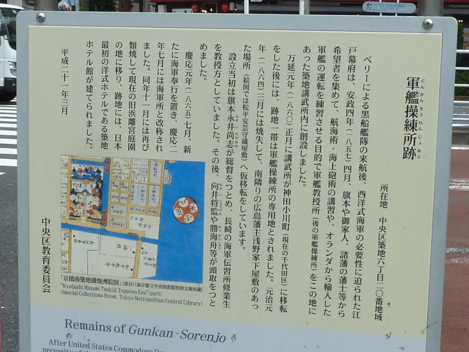 軍艦操練所の説明板には,1857年に築地講武所 (築地の佐倉藩の中屋敷跡地に1856年に開場した武芸訓練機関) 内に軍艦教授所が開設され,1860年に講武所が神田小川町に移転すると築地は軍艦操練所 (1864年に軍艦教授所を改称) の専用地となった.軍艦操練所 (1865年に軍艦所と改称) は1866年7月に海軍所と改称されたが,火災によって11月に焼失して現在の旧浜離宮庭園の地に移り,跡地には日本最初の洋式ホテルである築地ホテル館 (1868年開業) が建てられたと記されている.