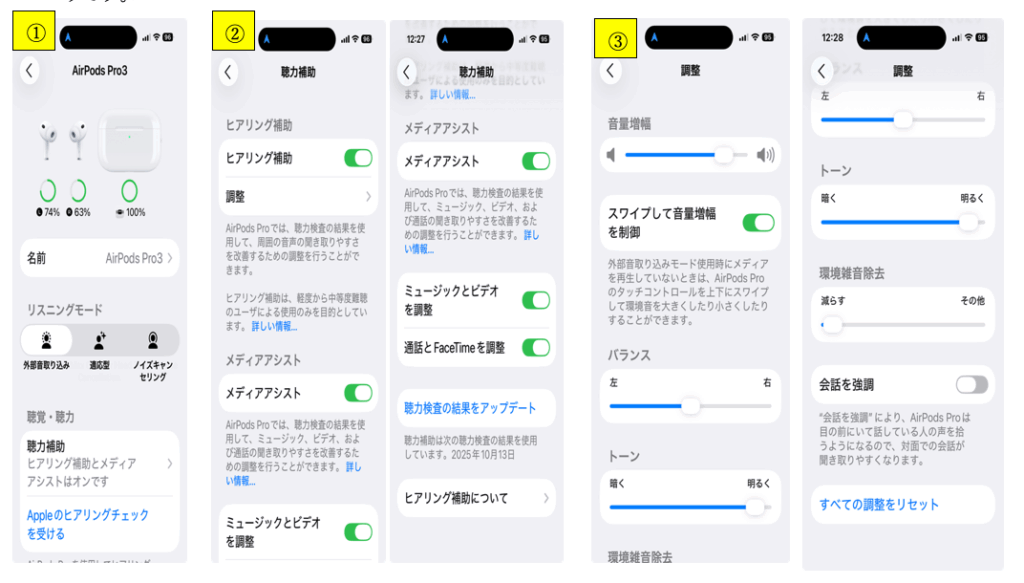 「ヒアリングチェック」の上の聴力補助をクリックすると②の画面になります。上から二つ目の調整をクリックすると③の画面になります。色々と調整して自分の耳に合った音を選んで下さい。私は、「音量増幅」を少し大きくし、「トーン」を明るくして会話を聞きやすくしています。