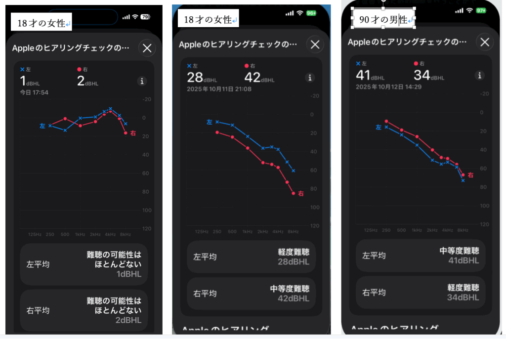最初に聴力検査をする場合は、①の画面下の「Appleのヒアリングチェックを受ける」を押して聴力検査を受けます。所要時間は10分程度ですが、回りのノイズが入ると検査が中断されます。耳鼻科の検査で使われる無音響室程度の静かさが求められるようで、夜テレビも消して実施して下さい。その際、自分の唾を飲み込む音も禁止です。一週間ごとにヒアリングチェックをしてみましたが、その日によって変化するようです。聴力が落ちたと思ったら何度でも繰り返して、調整出来ます。