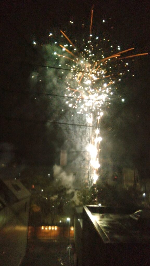 さて、10月は祭りの季節です。各週末にはそれぞれの地区などでお祭りがあり、手筒花火などがそれぞれの鎮守様に奉納され、五穀豊穣、家内安全などを祈ります。その先陣を切るのが、第一週の土日に開催される”羽田祭り”です。駅の西側の地区にある羽田八幡宮の例大祭で、豊橋駅の周辺の19町会が氏子として参加します。私が現在住んでいる町会もこの範疇に入ります。初日の土曜日は、八幡宮の御旅所とされる松葉公園で各町会からの手筒と大筒が奉納されるのですが、大筒は下の写真にあるように筒を支える台座がお神輿のようになっていて、各町会から順次街中を練り歩きつつ、この御旅所に来ます。そこで手筒と合わせてドカーン、ドカーンと打ち上げられますが、何分街中の小さな公園内で打ち上げられますので、家の中からも大きな音、風向きによっては大量の煙とにおいが襲ってきますので、窓はしっかりと閉めておかないと大変なことになります。今年は夕方6時頃から始まり9時過ぎまで全部で700本もの奉納があったようで、翌朝にはベランダの手すりに花火の燃えカスがいっぱい舞い落ちていました。屋外に駐車していた車の屋根にもさぞかし多くの燃えカスが付いていたことでしょう。