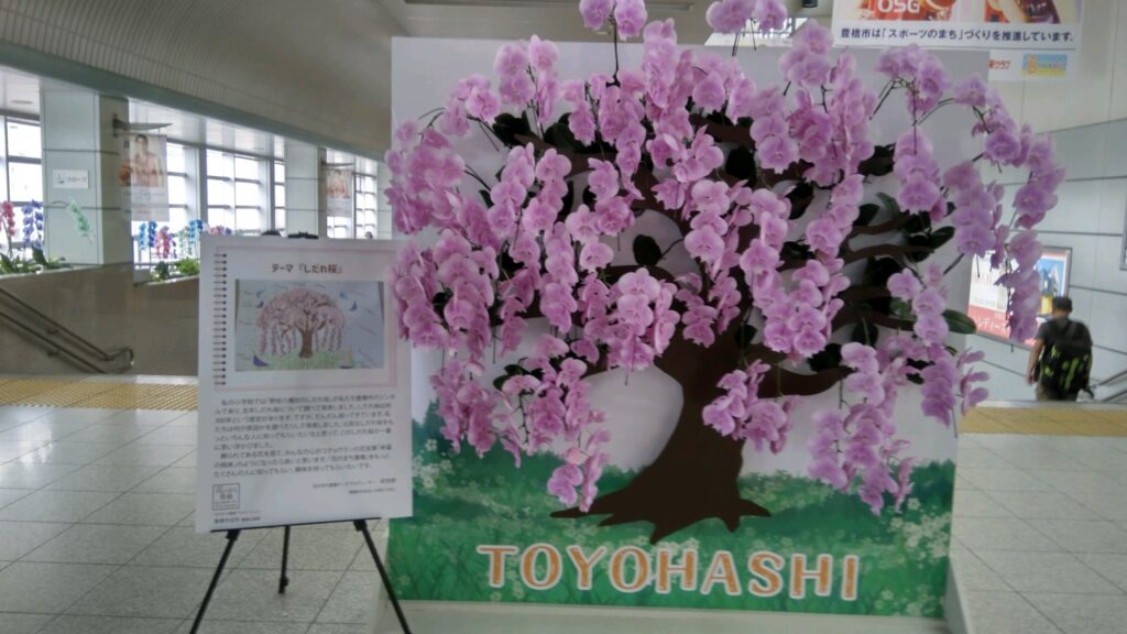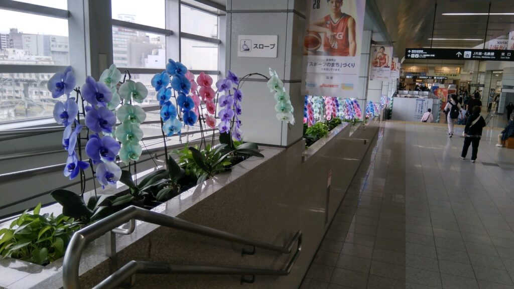 新幹線の改札口には地元出身の漫画家が豊橋を題材にした漫画を発表していることから、この推しなのでしょうか、漫画に登場するキャラクターの等身大の絵が飾られていたり、ストリートピアノが設置されていたりしますが、この秋の特別展示としてピンク色の胡蝶蘭による”しだれ桜”の展示が登場しています。こちらは市内の胡蝶蘭栽培業者による力作です。