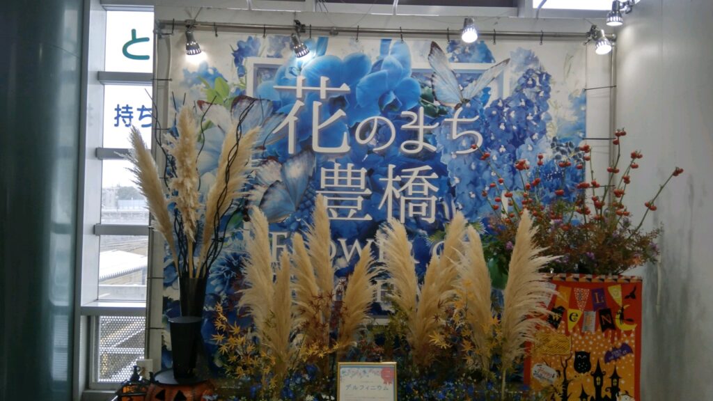 秋の名残ついでに今回は”花のまち”豊橋について紹介することにします。豊橋は市域の南部にある高師原や天白原周辺で白菜やキャベツなどの生産が盛んで、いわば意外にも隠れ農業都市です。実際に、農業生産額は県内で2位であり、全国でも9位にランキングされています。特に、大葉、トマトやウズラなどは地元でもよく知られています。この他にも花きの産出額も多く、全国1位の花き生産額を誇る愛知県内でもトップクラスに位置しています。中でも胡蝶蘭の生産量と産出額は県内で50%のシェアをもっています。このためでしょうか、JR豊橋駅の在来線(東海道本線と飯田線)と名鉄の共同改札口と新幹線の改札口とをつなげている東西通路には花の街をアピールする諸展示があります。例えば、JR豊橋駅の在来線と名鉄の共同改札口付近には”花の街”をアピールする常設展示コーナーがあり、四季それぞれに展示内容が更新されています。