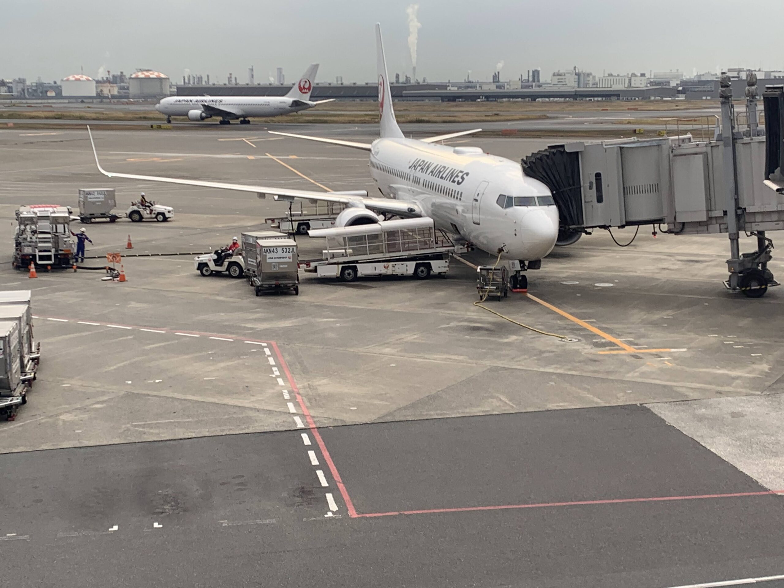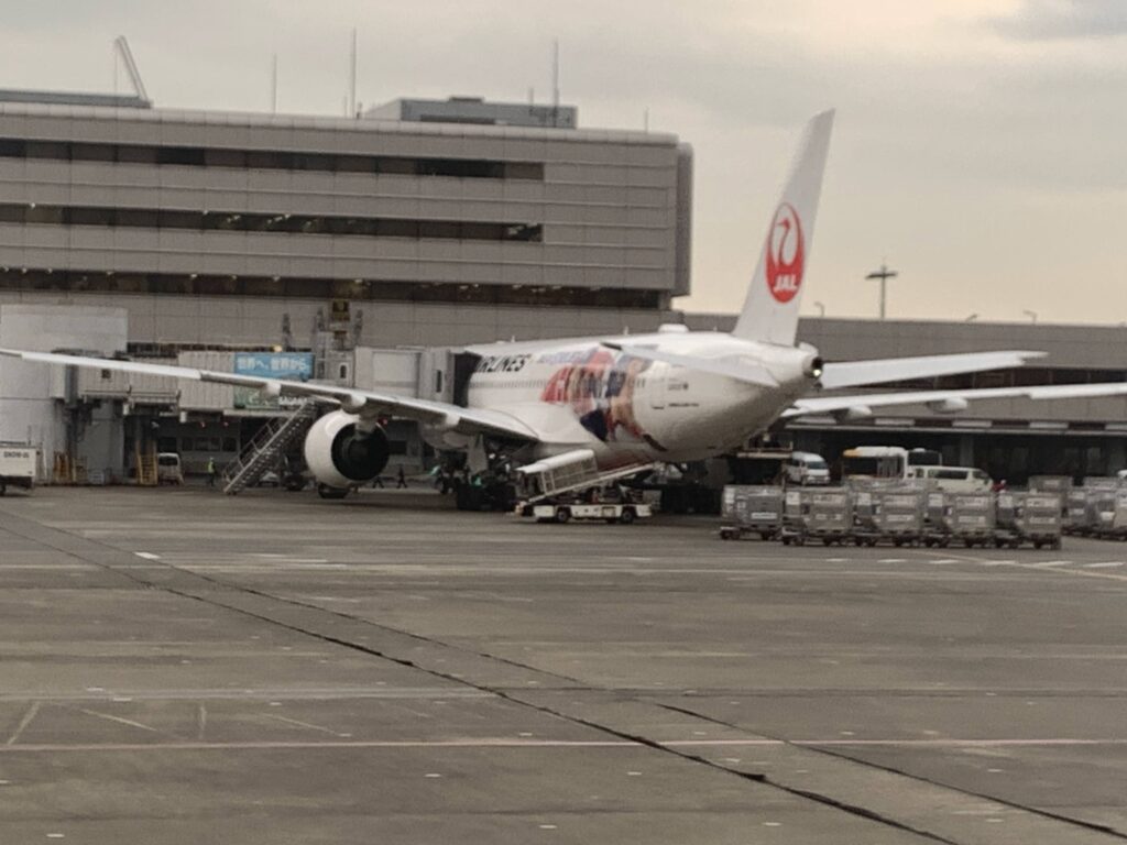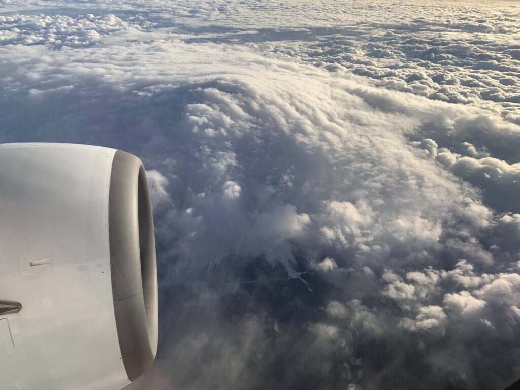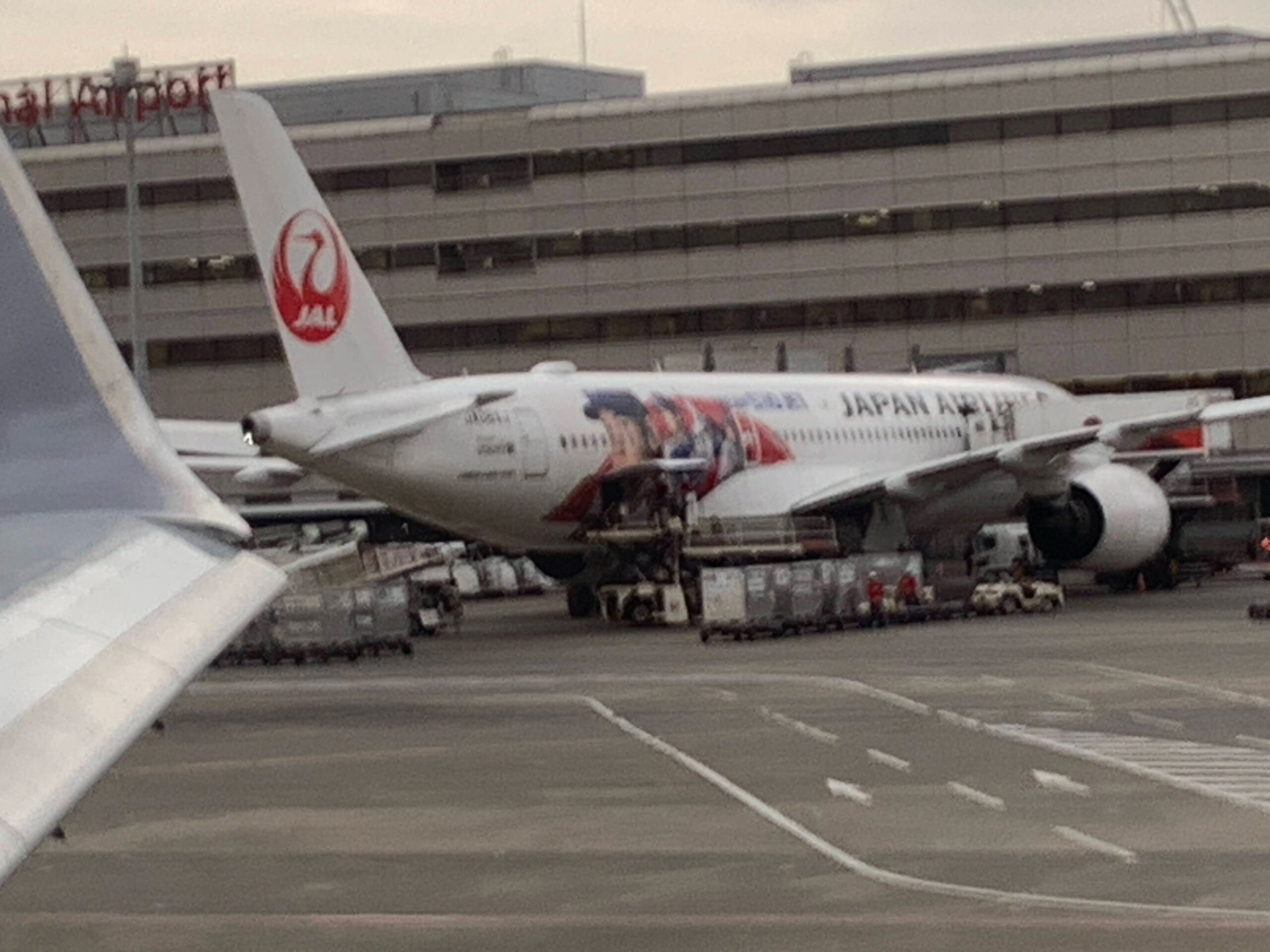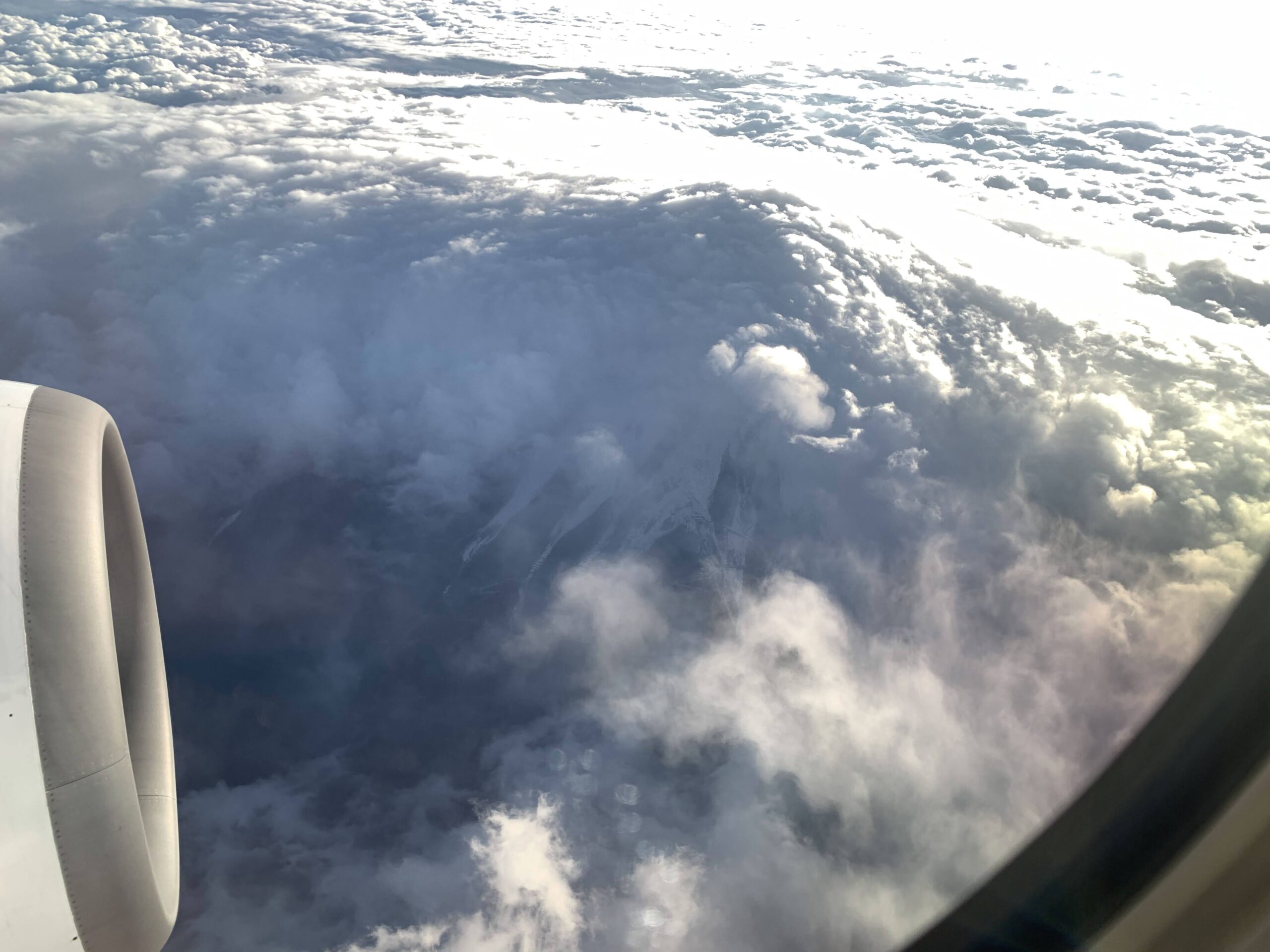 「川崎から見た富士山」でご報告したように,今年は10月23日が富士山初冠雪で雪の被った富士山が見れるのではと期待していました。ところが今日は,東京はどんよりとした曇り,富士山🗻を見るのは難しいだろうと,出発の機内で思いつつ,外を見ると,大谷さんが機体に描かれたJAL,すかさずスマホのシャッターを切りました。