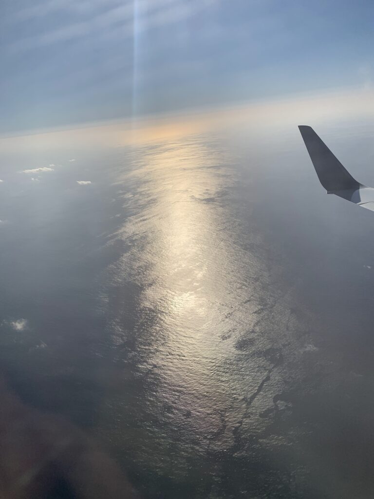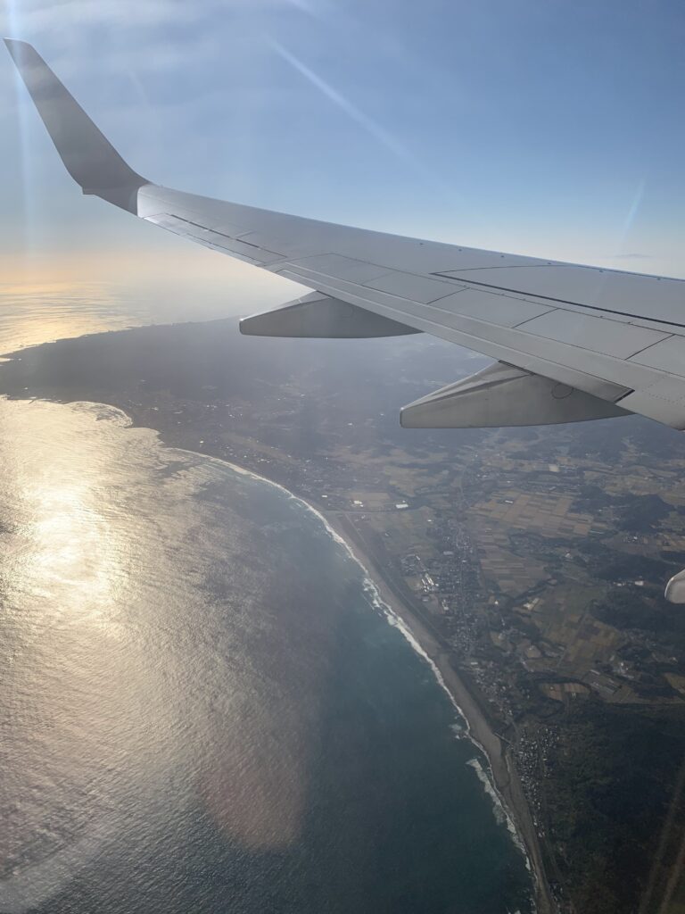 いよいよ,羽田空港へ着陸に入ります。午後なので,夕日が海面に反射して綺麗です。次いで房総半島上に入ります。