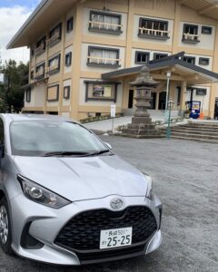 車はトヨタヤリス,昔の名前はビッツです。ここは鹿児島ですが,車のナンバープレートは長崎でした。まずは,レンタカー屋さんから車を借りて,島津斉彬 しまづ なりあきら 公を祀っている照国 てるくに 神社へお参りです。