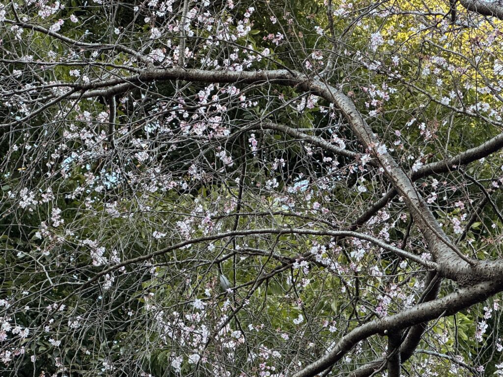 岩槻の久伊豆神社の駐車場に薄いピンクの花が咲いている木があった。近づいてみると冬桜。