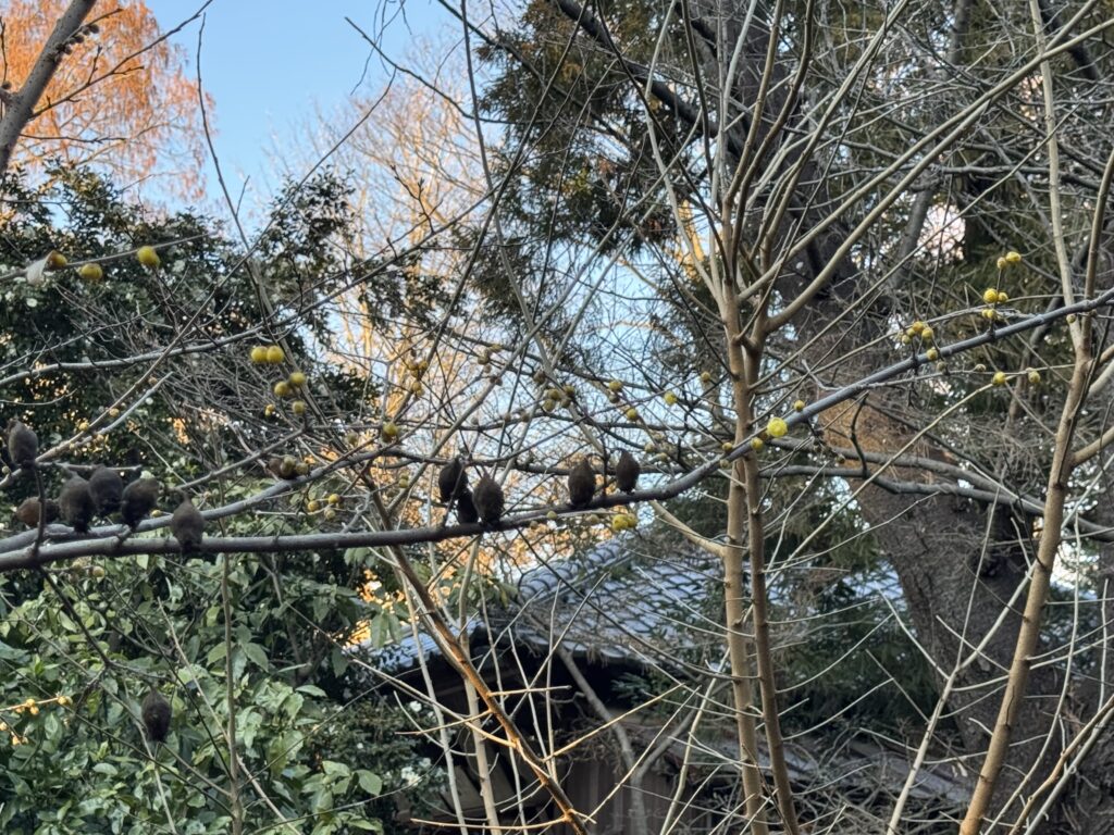 写真がわかり難いが、真中に黒い5つの実が付いて居るのがご覧頂けるかと思う。臘梅の実は枝から落ちずに翌年まで付いて居るので、受験に「落ちない」お守りになると言う。