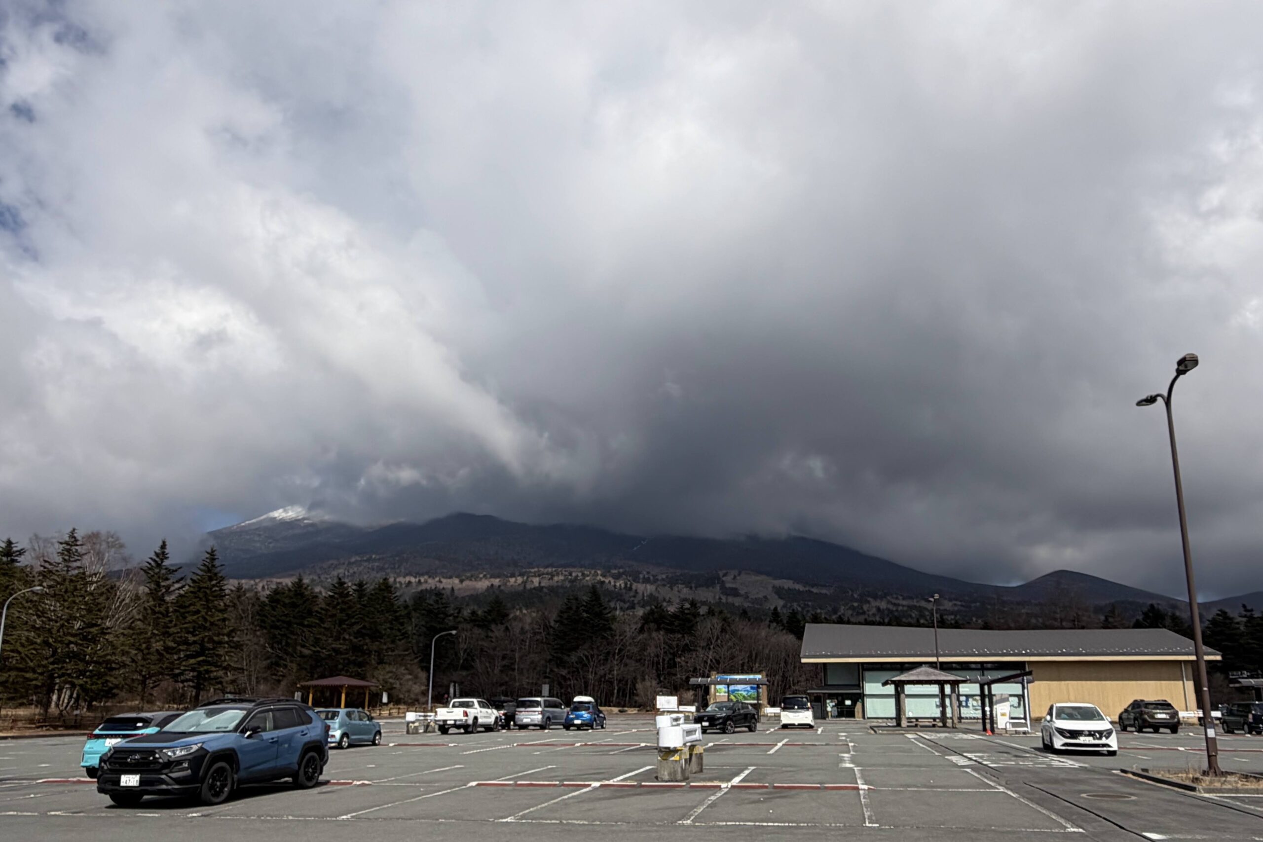 時間がたてば,雲もどいてくれるかもと御殿場から富士山スカイラインで標高1450mにある水ヶ塚 みずがづか の駐車場まできましたが,さらに雲が富士全体を覆い,ほとんど姿が見えません。