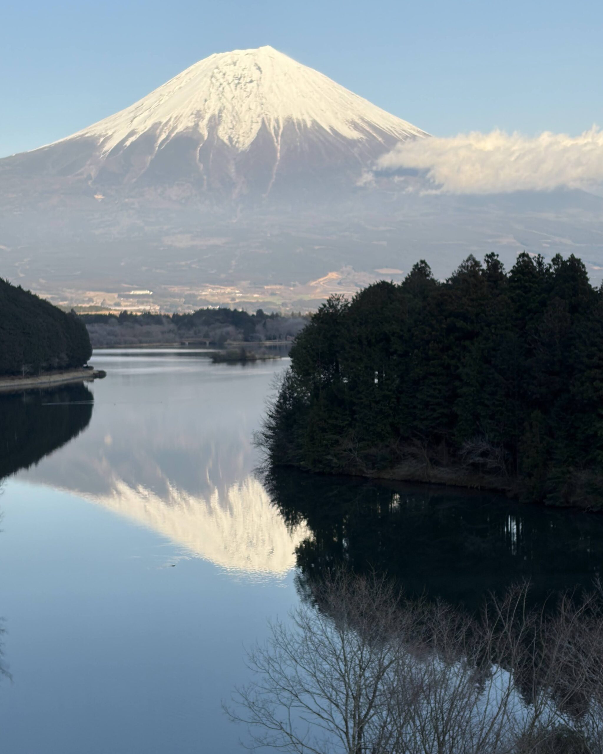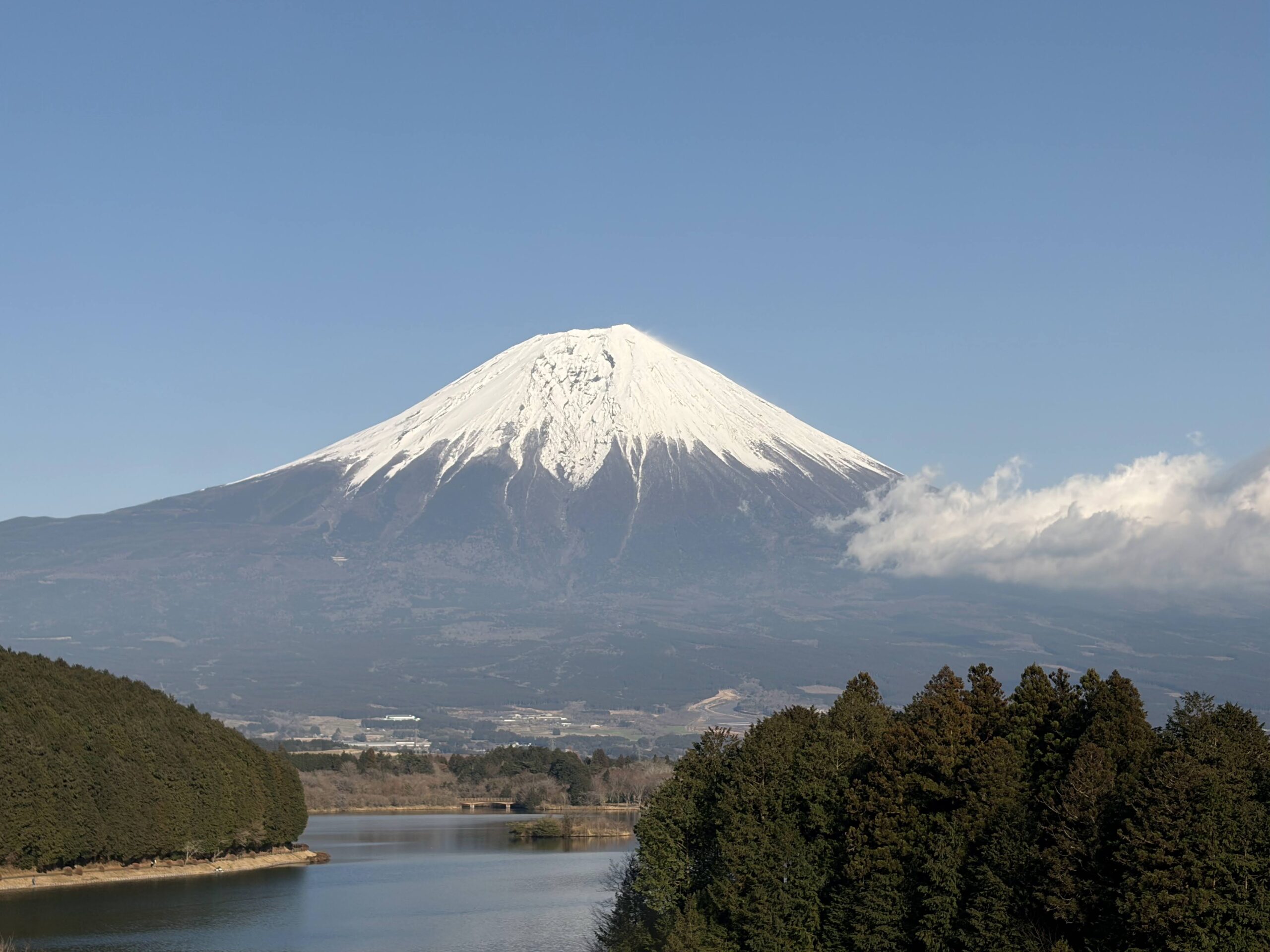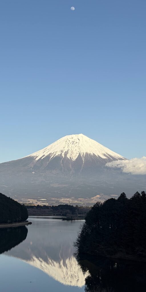 標高660mにある田貫湖は,富士山の西に位置し,ここも富士宮市になります。富士山の西のふもとの朝霧高原 あさぎりこうげん のさらに西側です。その田貫湖から見た西側の富士山です。綺麗です。