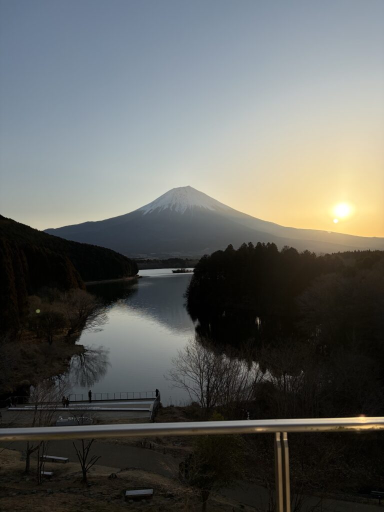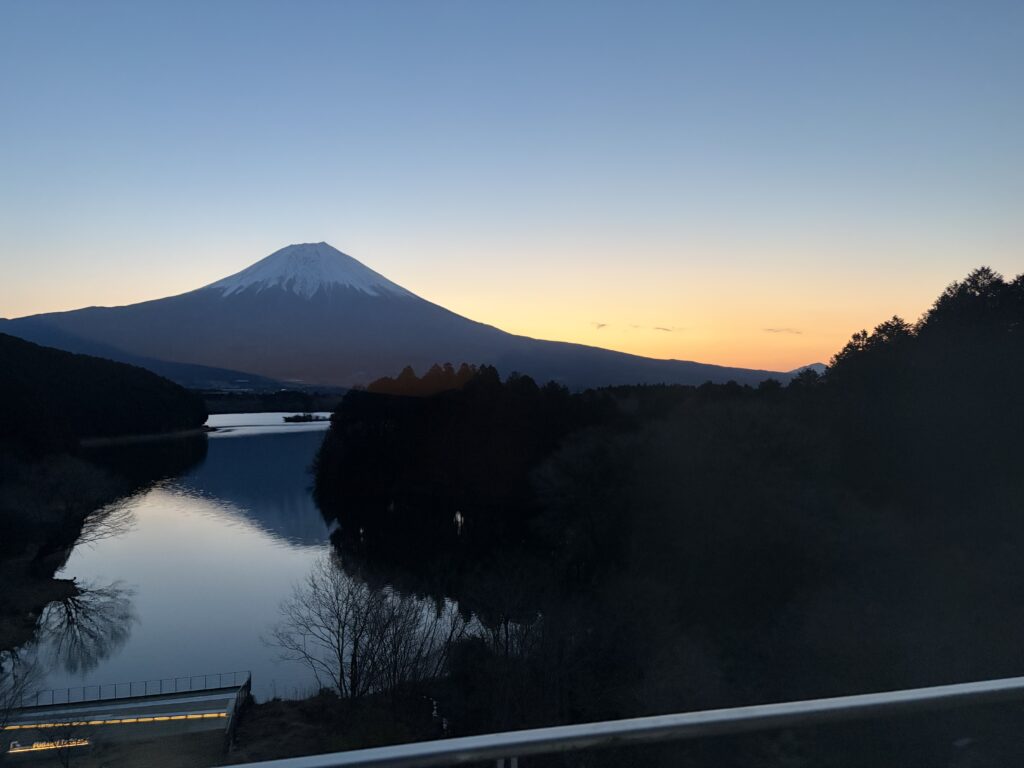 田貫湖で夕方に「逆さ富士」が見えるのは,風が少なく湖面が凪なぎの状態,かつ夕日が富士山に当たることで見えるそうです。