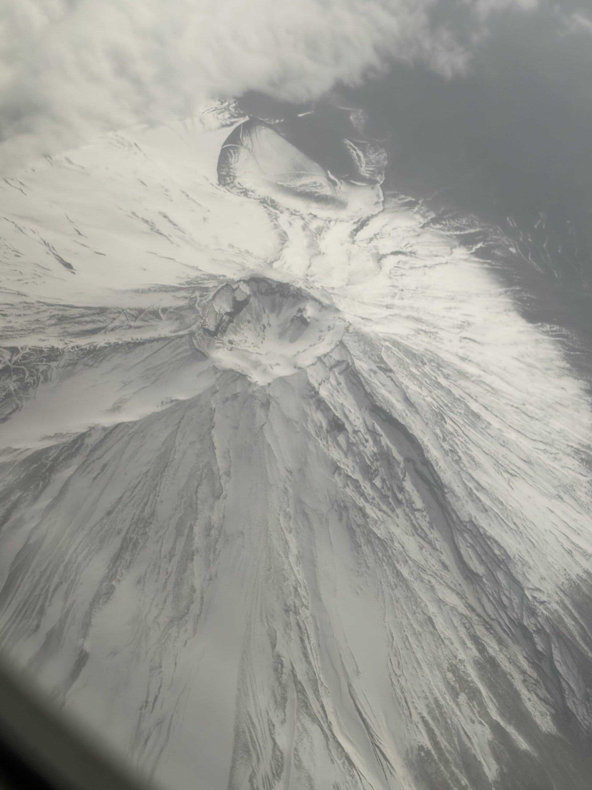 次の日,今日は岡山へ飛ぶ日,前日と違って羽田空港は曇り,離陸後の飛行機はすぐに雲の中。昨日は晴れでよかったのにと,眼下をみたらなんと‼️ど~んと。富士山です。